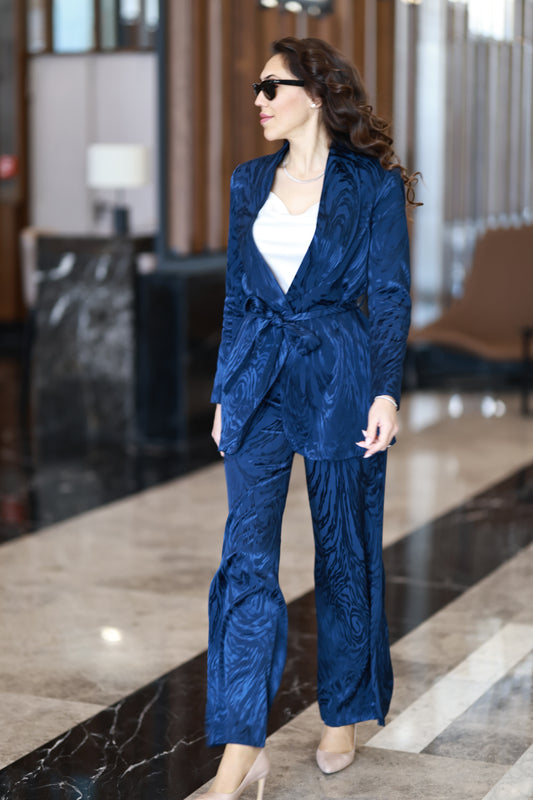 Bağlamalı Kuşaklı Jakarlı Lacivert Ceket