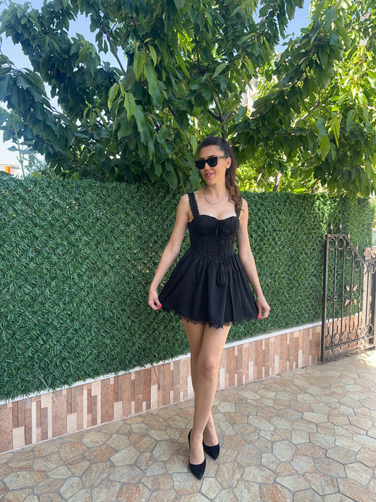 Dantel ve Korse Detaylı Siyah Mini Elbise