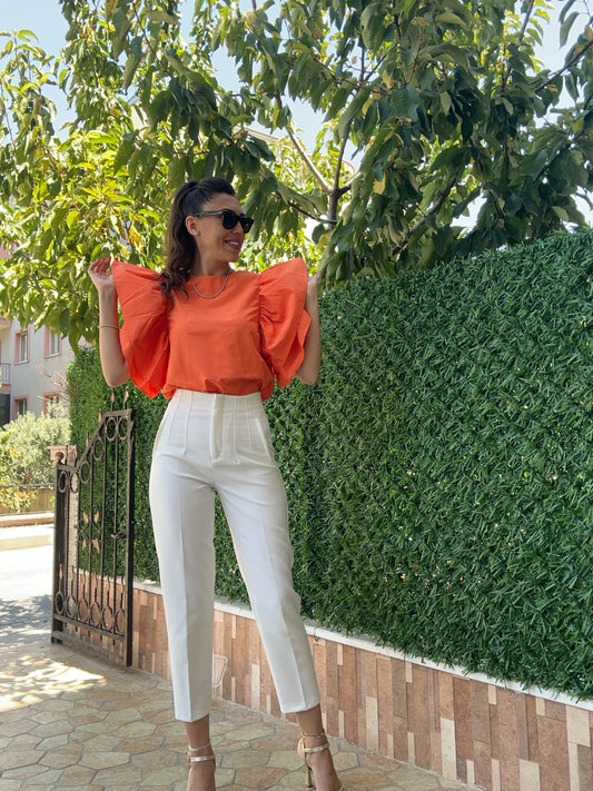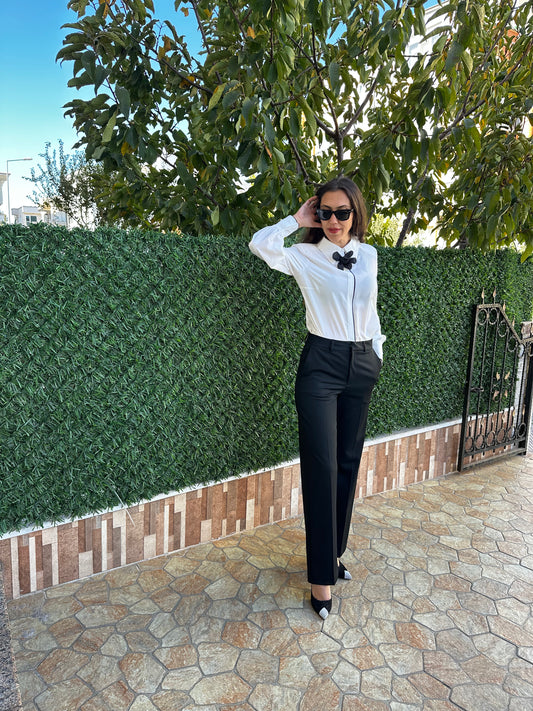 Biye Detaylı Yakası Çiçek Aksesuarlı Beyaz Bluz