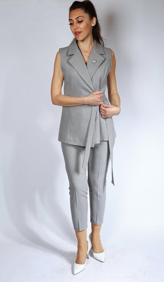 Kemer ve Broş Detaylı Gri Yelek Pantolon Takım