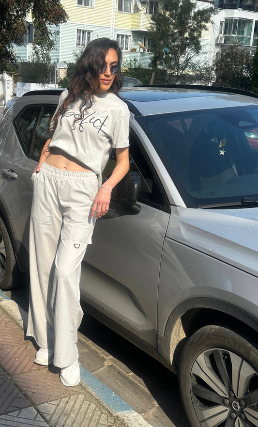Gri Baskı ve Taş Detaylı Basic Tshirt