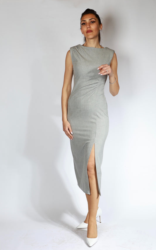 Yırtmaç ve Drape Detaylı Full Esnek Midi Boy Gri Renk Elbise