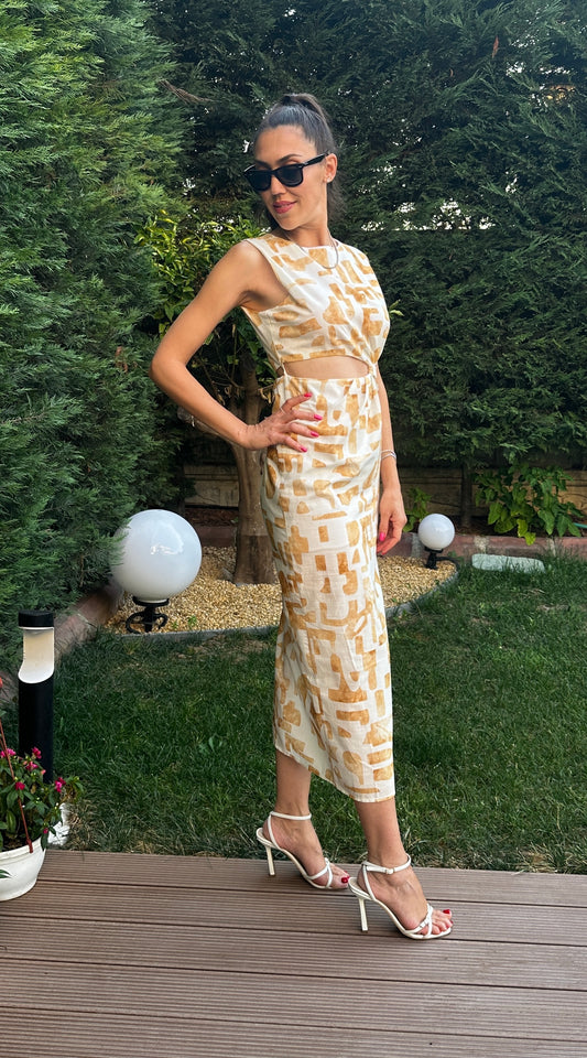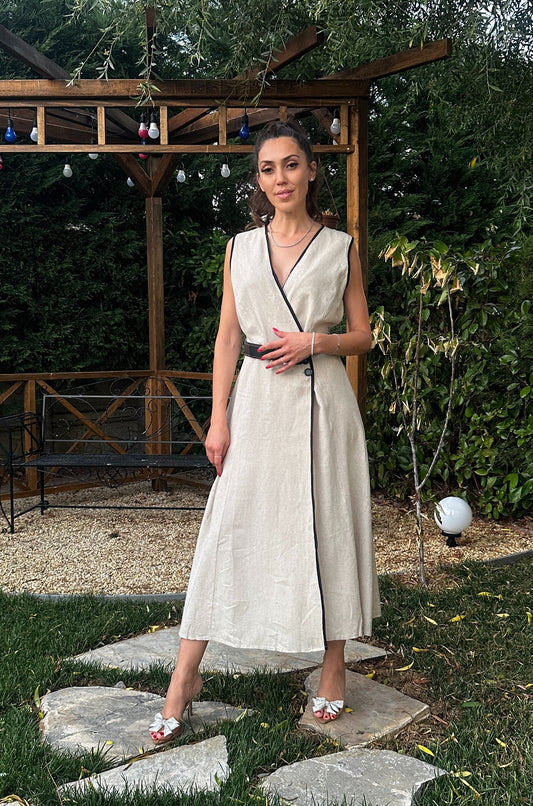Yırtmaç ve Bel Dekolteli Keten Elbise